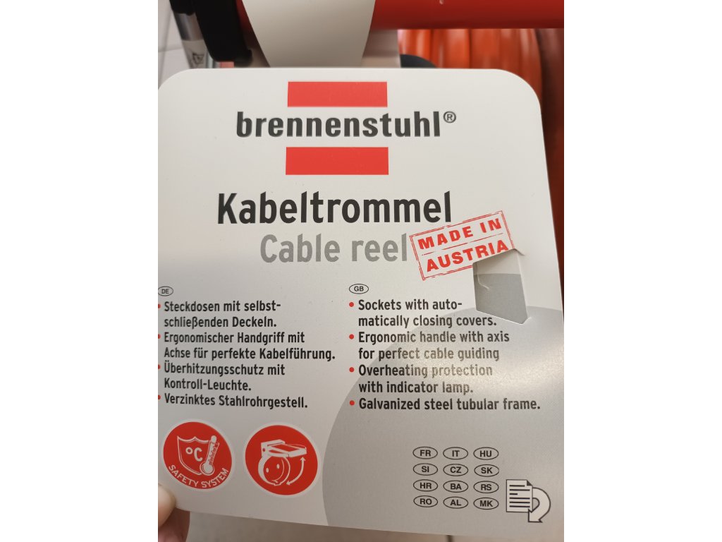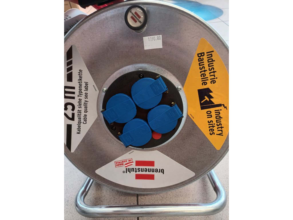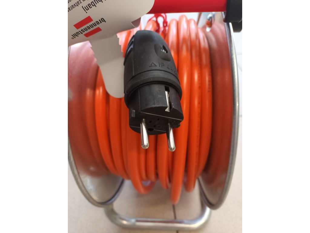 Vysoce kvalitní staveništní prodlužovací kabel na bubnu profesionální rakouské značky Brennenstuhl obsahuje 4 zásuvky s víčkem v krytí IP44 ve středu bubnu a staveništní kabel délky 25m. Dále ergonomickou rukojeť s osou usnadňující vedení kabelu. Víčka zásuvek jsou samozavírací a vidlice kabelu je z pryže. Maximální životnost zajišťuje ocelový buben i stojan z pozinkované oceli odolné proti korozi. Buben je díky stojanu velmi stabilní. Bezpečnost a ochranu proti přehřátí zajišťuje tepelná pojistka (červená kontrolka). Speciální oranžový staveništní kabel má řadu výhod: na rozdíl od gumového kabelu je otěruodolný, což je důležité při kontaktu s drsnými povrchy - betonem, kamenem a stavebními materiály. Navíc je odolný vůči UV záření a olejům. Disponuje odolností vůči extrémnímu mechanickému zatížení i v nízkých teplotách. Tento staveništní kabel je určen na staveniště a do průmyslu, ke krátkodobému (ne trvalému) venkovnímu použití.