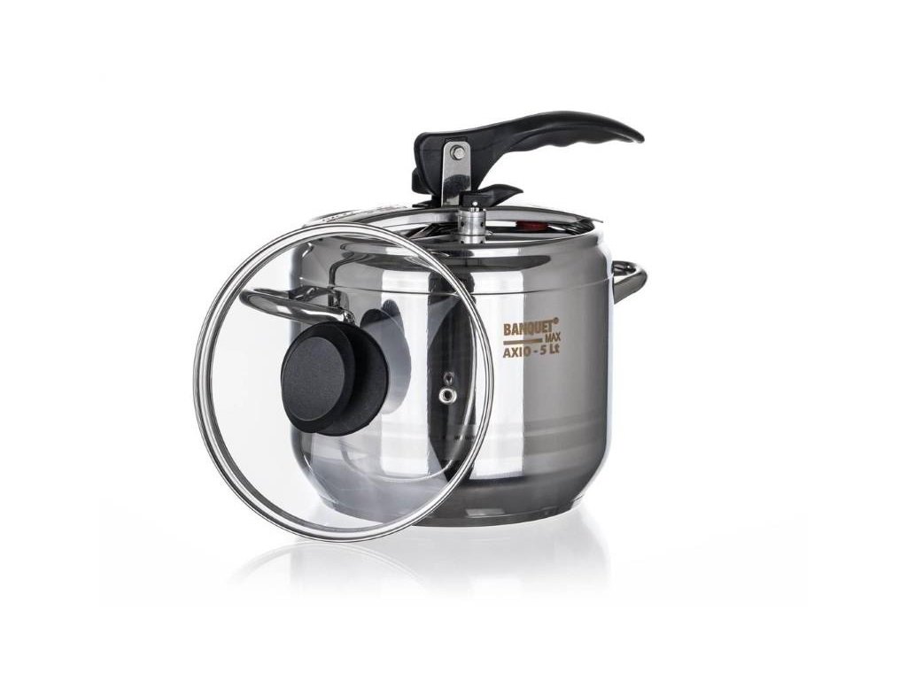 Nerezový tlakový hrnec 5 l s pákovým uzávěrem a skleněnou poklicí, průměr 20 cm, nerez 18/0, 3 ventily, silné sendvičové dno. Víko obsahuje tři ventily oproti předchozím modelům, hlavní pracovní ventil, bezpečnostní ventil a silikonový ventil pod přítlačnou sponou pro úplně bezpečné použití. Pákový uzávěr je zabezpečený proti náhodnému otevření. Díky speciálnímu tvaru a bezpečnostnímu ventilu nelze tlakový hrnec během vaření otevřít. Tlakový hrnec je určen pro rychlou přípravu pokrmů a lze jej používat na všechny typy varných desek vč. indukce. Hrnec je v silnostěnném celonerezovém provedení, má silné sendvičové dno a lze ho používat na všechny typy varných desek.