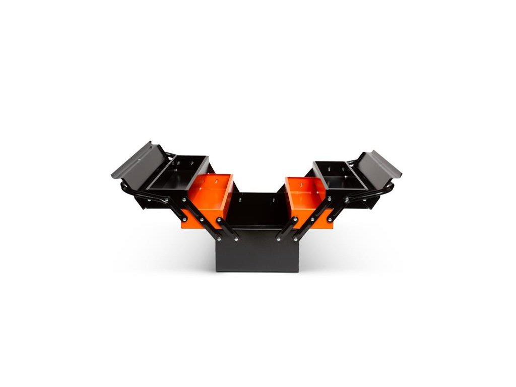Kufřík na nářadí s klasickým uspořádáním s otevíráním ve způsobu harmoniky. Vyrobeno z odolného kovu, takže odolá i intenzivnímu používání. Široký otvor umožňuje snadný přístup k nářadí. Různé nástroje mohou být díky tří poličkovému uspořádání uloženy úhledně, jasně a snadno přístupně.