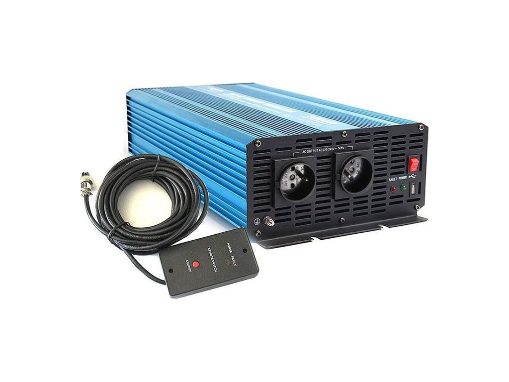 Měnič napětí 24V/230V+USB 3000W, CARSPA P3000, čistá sinusovka + dálkové ovládaní . Měnič je vhodný pro spotřební elektroniku, nářadí i jiné spotřebiče s nároky na čistý sinusový průběh výstupního napětí. Součástí je dálkové ovládání s kabelem a indikací zapnutí a chybových stavů.