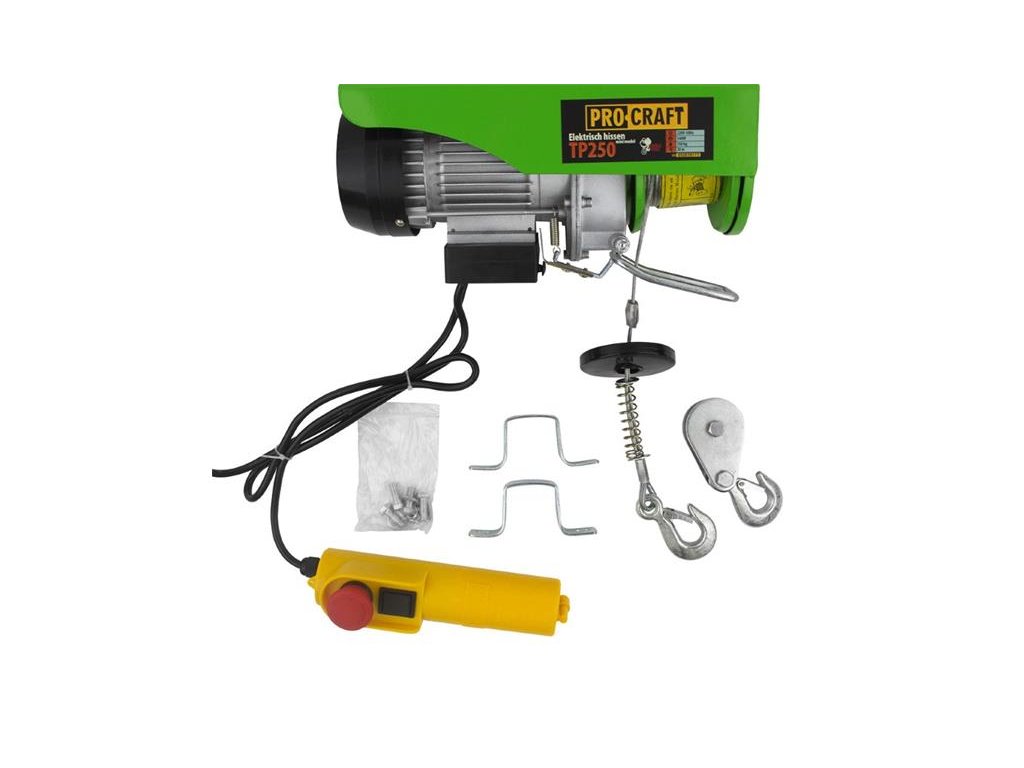Elektrický lanový naviják Procraft TP250 je určen k spouštění nebo zdvihání pevných břemen. Vysokou nosnost až do 250kg umožňuje silný indukční motor s výkonem 510W. Bez kladky umožňuje zvedání až 125kg na výšku až 12m. Možnost použití s jednoduchým nebo dvojitým závěsem pomocí kladky. Kvalitní ocelové lano a spolehlivý motor zaručuje dlouhou bezporuchovou práci. Součástí dodávky jsou 2 úchytky, ocelové lano. Balení karton.