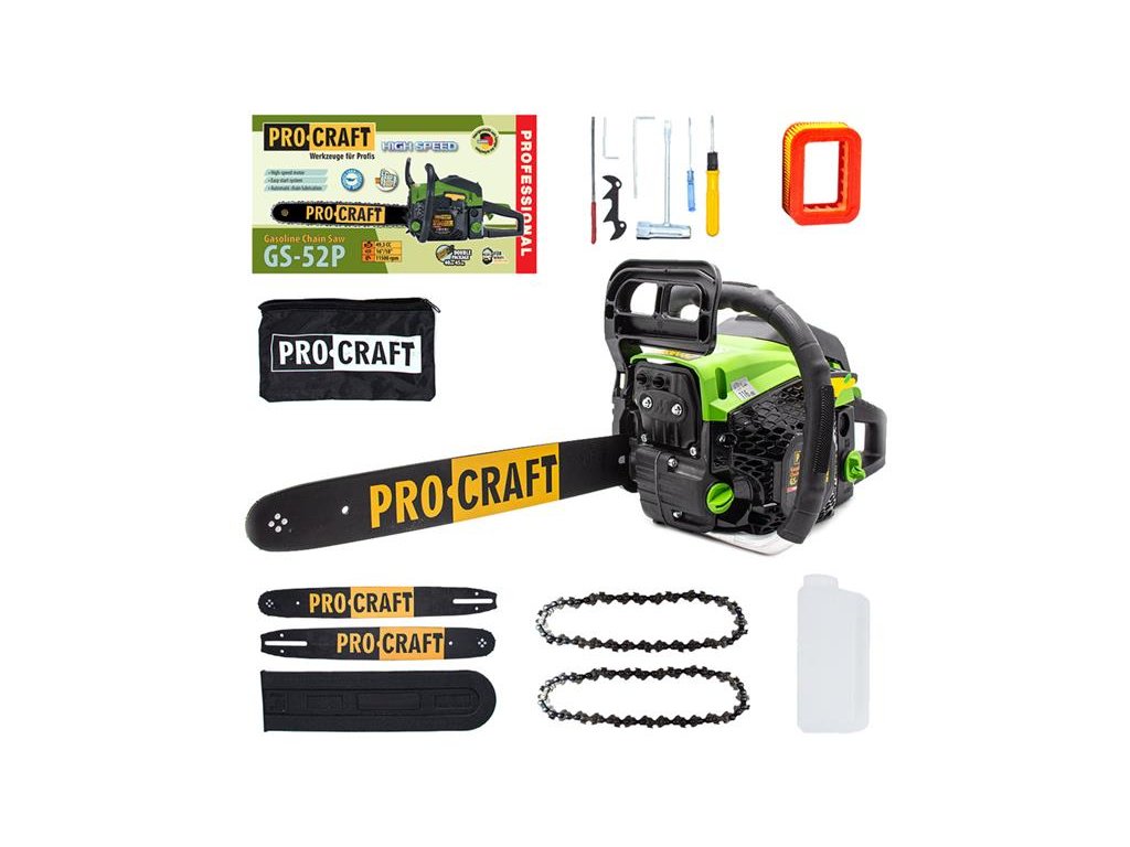 Benzínová řetězová pila Procraft GS-52P je určena ke kácení stromů, zpracování palivového dřeva, prořezávání velkých větví. Silný benzínový motor s příkonem 2100W a vysokých otáček až 11500 za minutu zaručuje dlouhou bezporuchovou práci. Automatický systém mazání řetězu a kvalitní lišta zvyšují spolehlivost stroje.