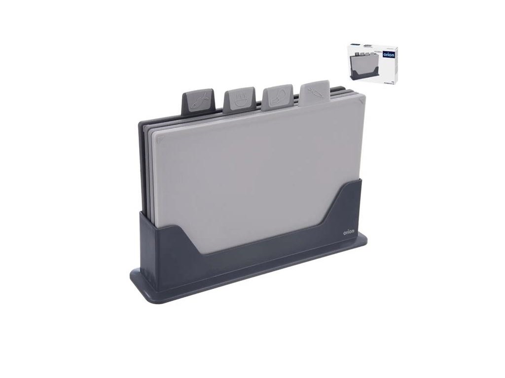 Oboustranné krájecí prkénko je tvarované tak, aby z něj šťávy z krájených potravin nestékaly. Protiskluzové podložky ho udrží pevně na místě a prkénko je jimi opatřeno z obou stran. Každé prkénko má štítek s obrázkem, díky němuž můžete rozlišit, na co prkénko používáte – je výhodné mít při vaření prkénka rozdělená na krájení zeleniny, syrového masa, tepelně upravených pokrmů a ryb. Všechna 4 prkénka pohodlně uložíte do stojanu a můžete je mít na kuchyňské lince vždy při ruce. Stojan je opatřen pěnovými podložkami, takže se po podložce nesmeká a nepoškodí ji.