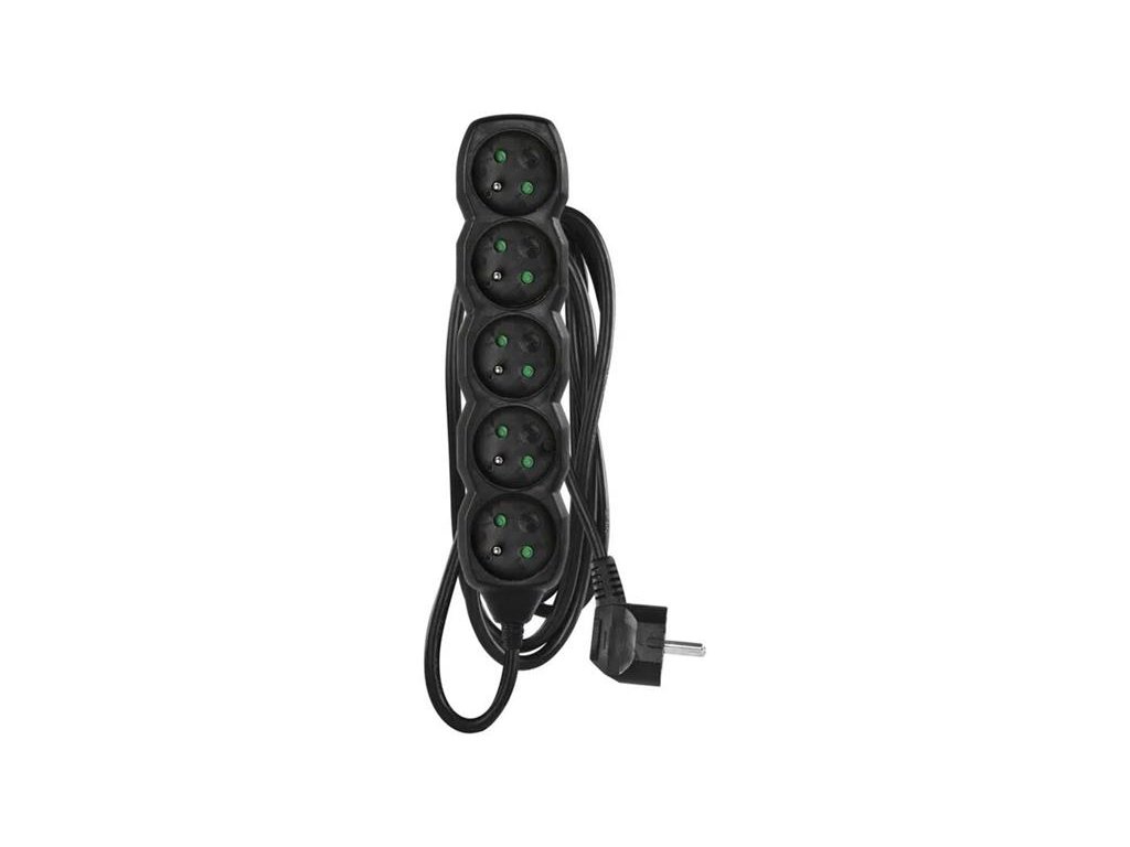 Černý prodlužovací přívod, 5 zásuvek, délkou 2 m a průřezem vodiče 1 mm2. Vhodný pro maximální zátěž 16 A max. Montážní otvory pro přichycení zásuvky na zeď.