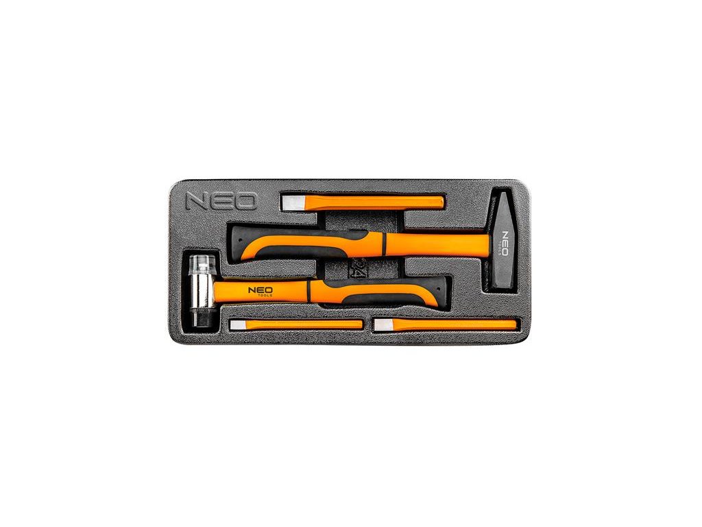 Sada obsahuje 3 razidla a 2 kladiva. Razníky z vysoce kvalitní chromvanadiové oceli prodlužující životnost nástroje. Odolnost a spolehlivost při každodenní práci zajistí zámečnické kladivo a plechové kladivo se sklolaminátovými násadami. Dodává se v plastovém výlisku, který se hodí k zásuvkám dílenských skříní. Spolehlivost výrobku potvrzuje 25letá záruka. Značka NEO splňuje očekávání profesionálů.