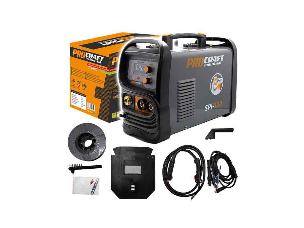 Svářecí invertor Procraft SPI-320 je určen k ručnímu svařování metodami MIG a MAG. Výkonové tranzistory IGBT zaručují dlouhou bezporuchovou práci. Regulace svařovacího proudu v rozsahu 20-160 A umožňuje nastavení optimálních parametrů při práci s různými kovy. Lze použit svařovací drát s průměrem 0,6 až 1,0 mm. umožňuje svařování s inertními nebo aktivními plyny. Pomocí LCD Displeje je zobrazován aktuální svařovací proud. Součástí dodávky je svařovací drát 0,8mm (5 kg buben), MIG hořák s kabelem, svářečský štít, kabel s držákem elektrod, kabel se zemnícími kleštěmi a drátěný kartáč kombinovaný s kladivem na strusku.